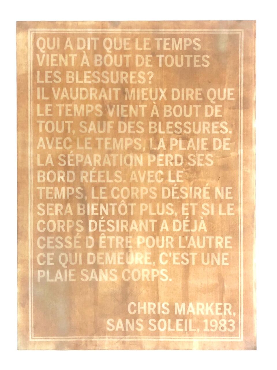 Il tempo, forse, scurirà le parti che rendono leggibile la citazione facendo piombare l’operazione artistica nell’intangibilità; allo stesso tempo, se questo dovesse accadere, la luce guarirà quella ferita, quella traccia, solcata sul corpo dell’immagine, conferendo e confermando alla materia fotografica il suo carattere organico, elevandola tra gli esseri viventi. Nessuna toeletta inutile per chi va certo al patibolo: solo così vivrà in eterno.