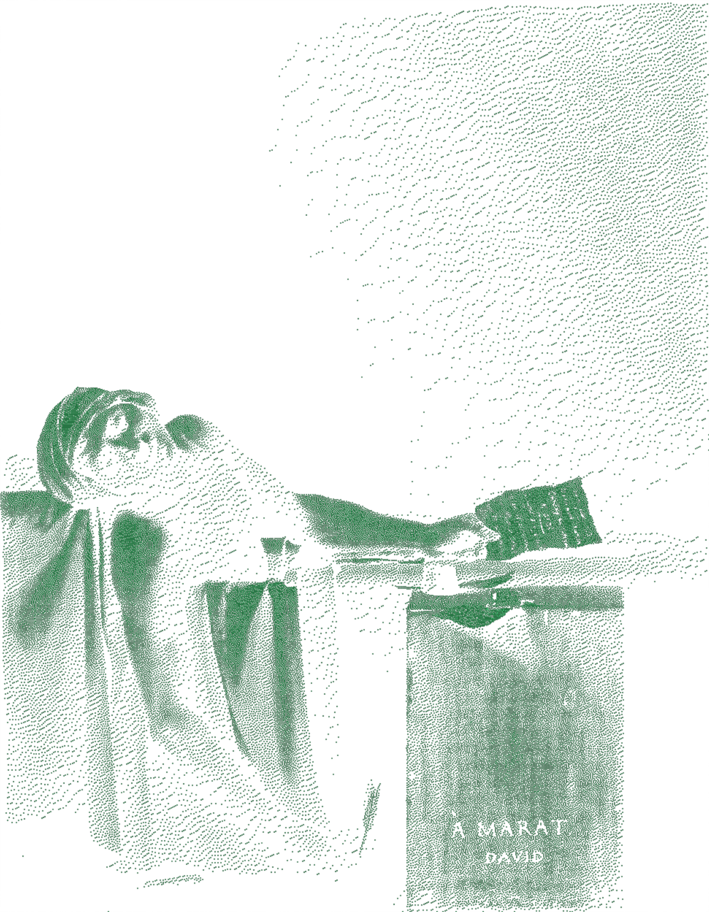 La vasca, luogo intimo per eccellenza, diventa così uno spazio accessibile allo sguardo. Alla dimensione privata si sostituisce quella pubblica, quella del corpo esposto di Cristo che si fa testimone di un sacrificio la cui potenza non parla più del corpo singolo ma della nostra società. Marat è ancora immerso nell’acqua, nell’altra mano tiene la lettera che Charlotte Corday gli aveva consegnato poco prima, quella con cui era riuscita a entrare nella stanza e a ottenere un colloquio in un giorno in cui nessuno doveva essere ricevuto. Lo colpì al petto, animata dall’intento di voler fermare colui che riteneva responsabile del sangue versato in quei giorni convulsi nella Parigi in rivolta del 1793.