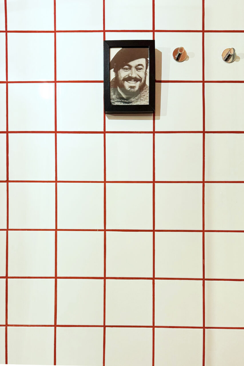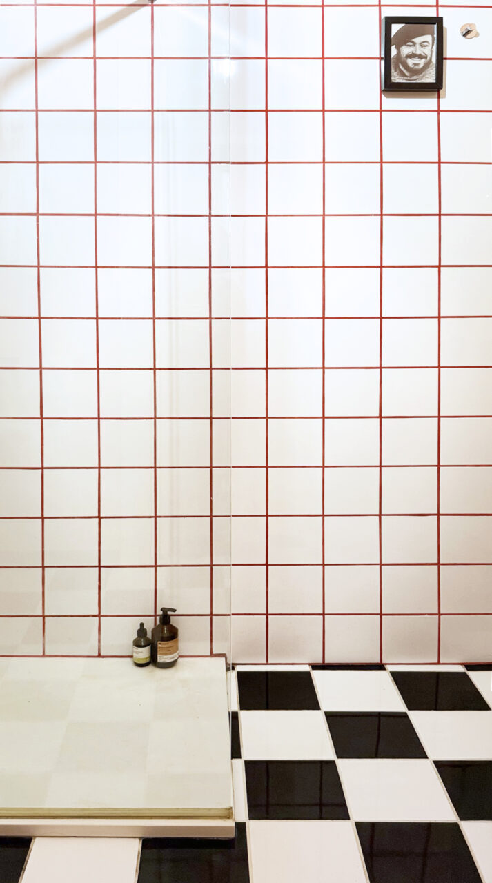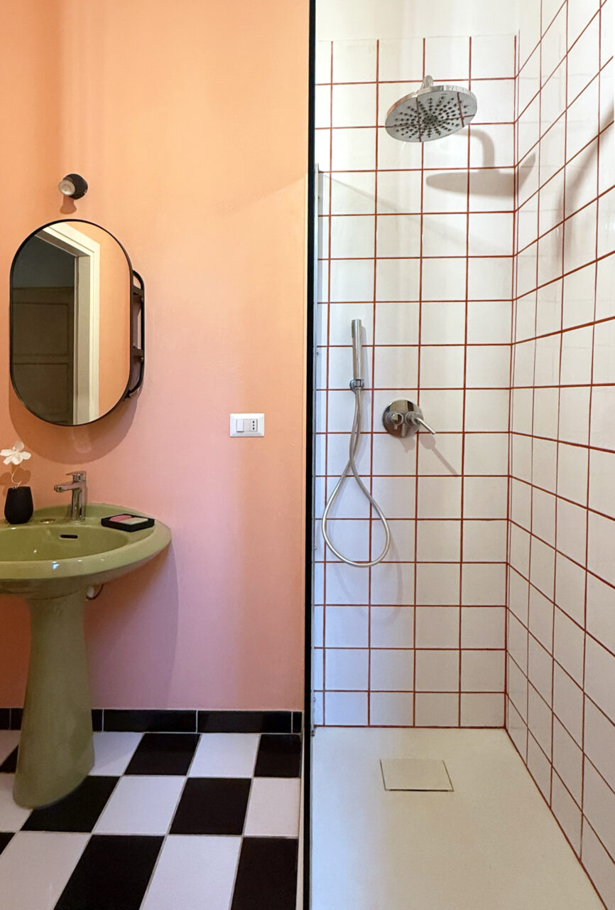 Le piastrelle a km zero e le fughe rosse per la doccia: ore di lavoro di un piastrellista volenteroso, uno di quelli che mentre posa la colla ti parla di reincarnazione e vite passate, tra polvere e sudore. Un lampadario di vetro, scovato tra le cianfrusaglie di un mercatino di paese. Con poco è tornato a brillare.