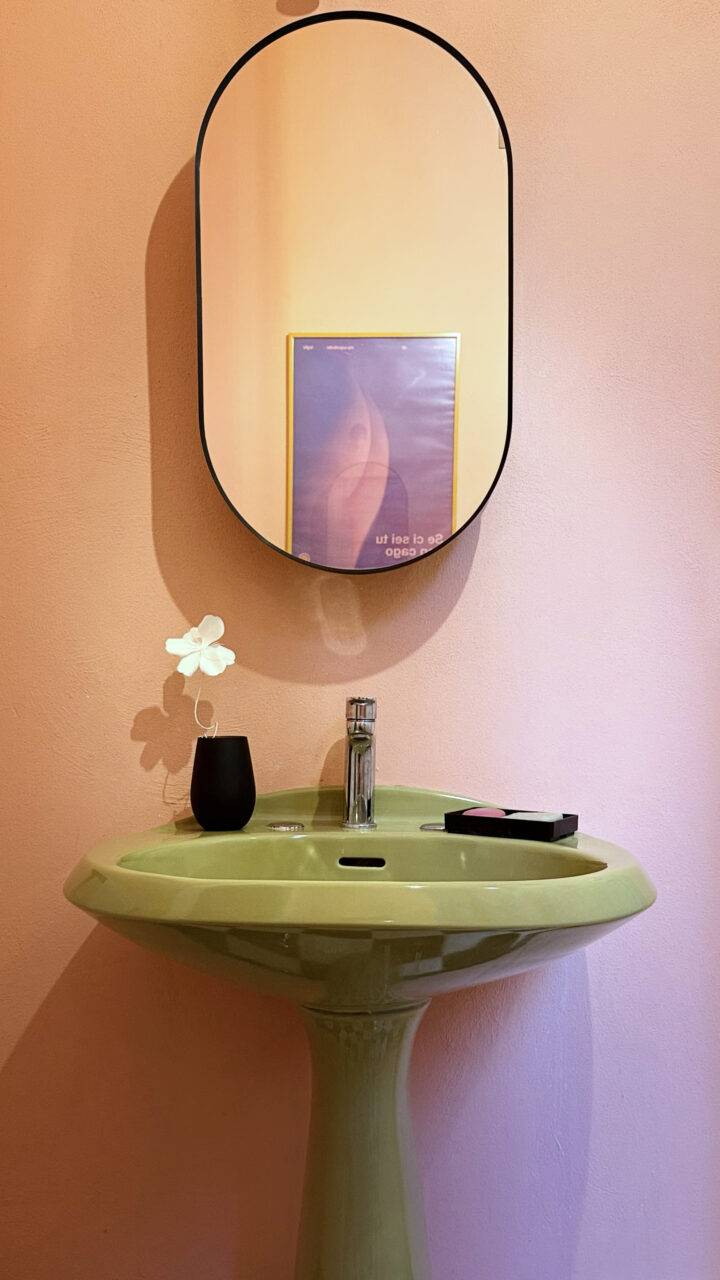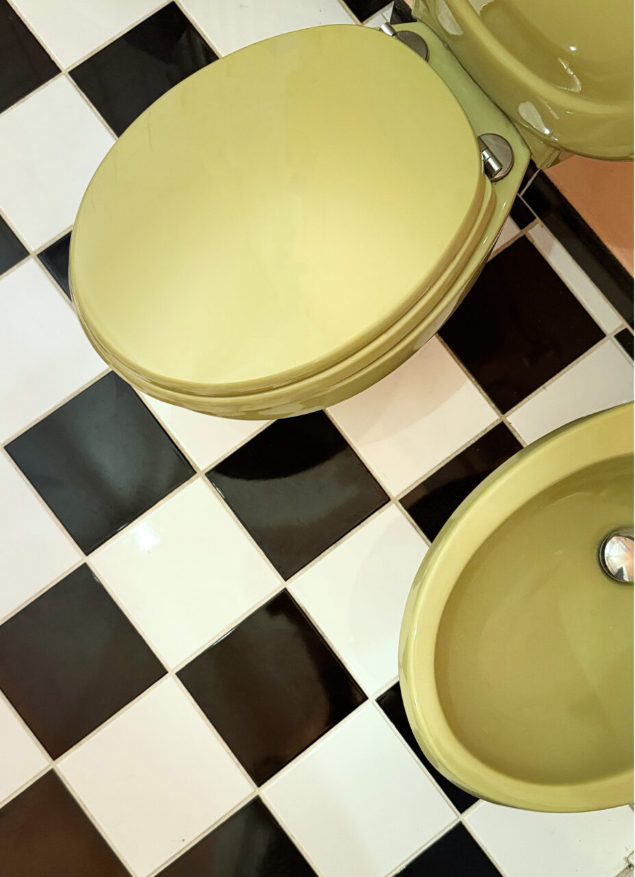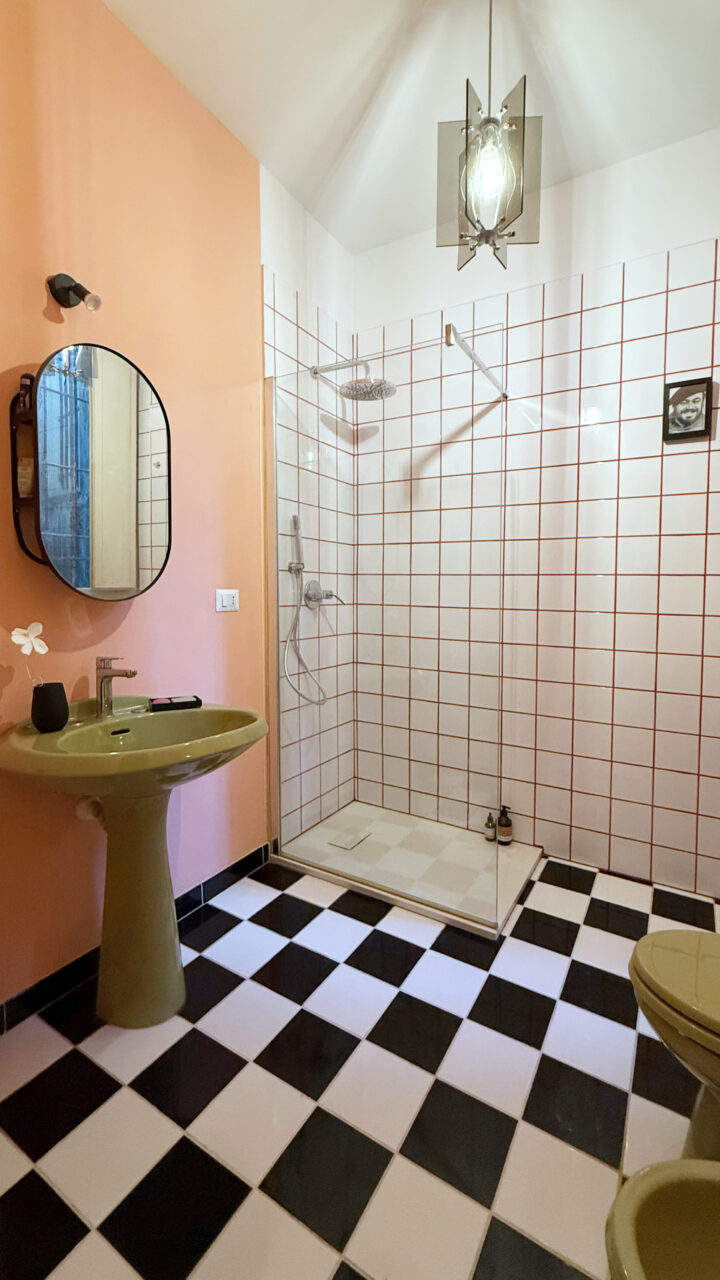 I sanitari provengono da un market online: una giovane coppia mantovana li aveva smantellati da una casa in ristrutturazione, comprato il set completo a pochi euro, il costo di una pizza al sapore di Ideal Standard anni ’70 in vetrochina. La cassetta di scarico, marchiata Ginori, dello stesso verde , arriva poco dopo dalla Sicilia, dopo ricerche estenuanti. Un match cromatico perfetto che sa di provvidenza. I componenti meccanici, ormai fuori produzione, sono stati recuperati con tenacia da un amico che lavora nell’idraulica. Ogni volta che tiro lo sciacquone, lo penso soddisfatta. <Grazie Lello>.